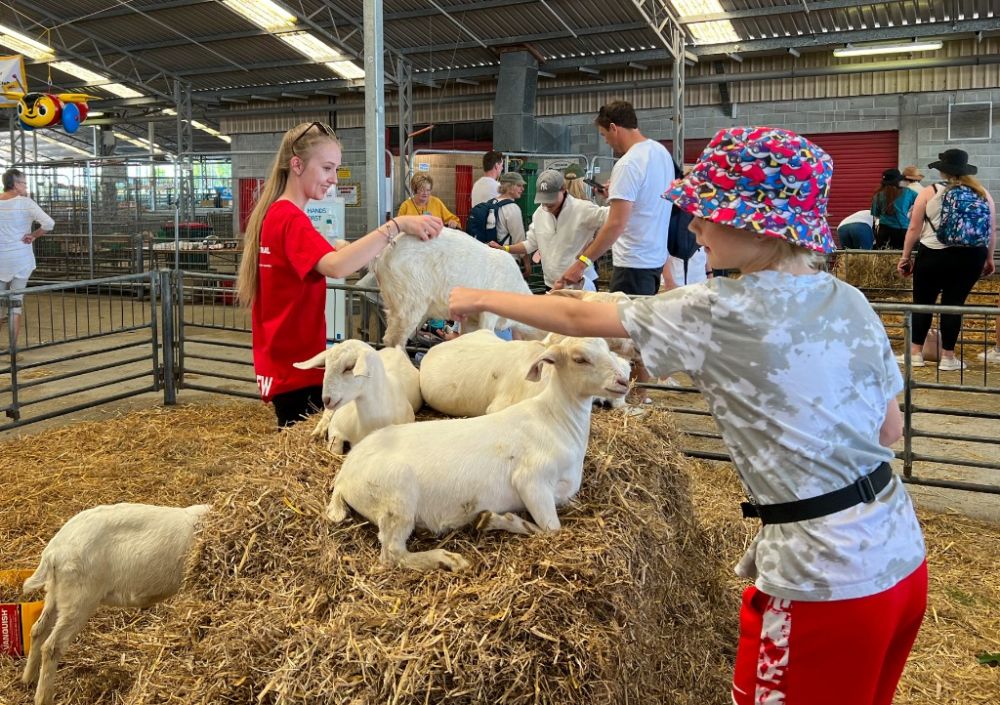 2022年11月9日,在新西兰南岛克赖斯特彻奇举行的坎特伯雷农业展上,小朋友在羊圈内与羊互动。新华社发(瓦尔特摄)